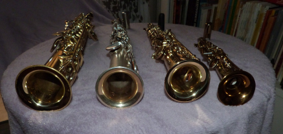 Four straight saxophones : Bb soprano Selmer SA III lacquered, C-soprano Buescher silver-plated, Sopranino BG in Eb , Soprillo Eppelsheim in Bb (the 2 last are lacquered).